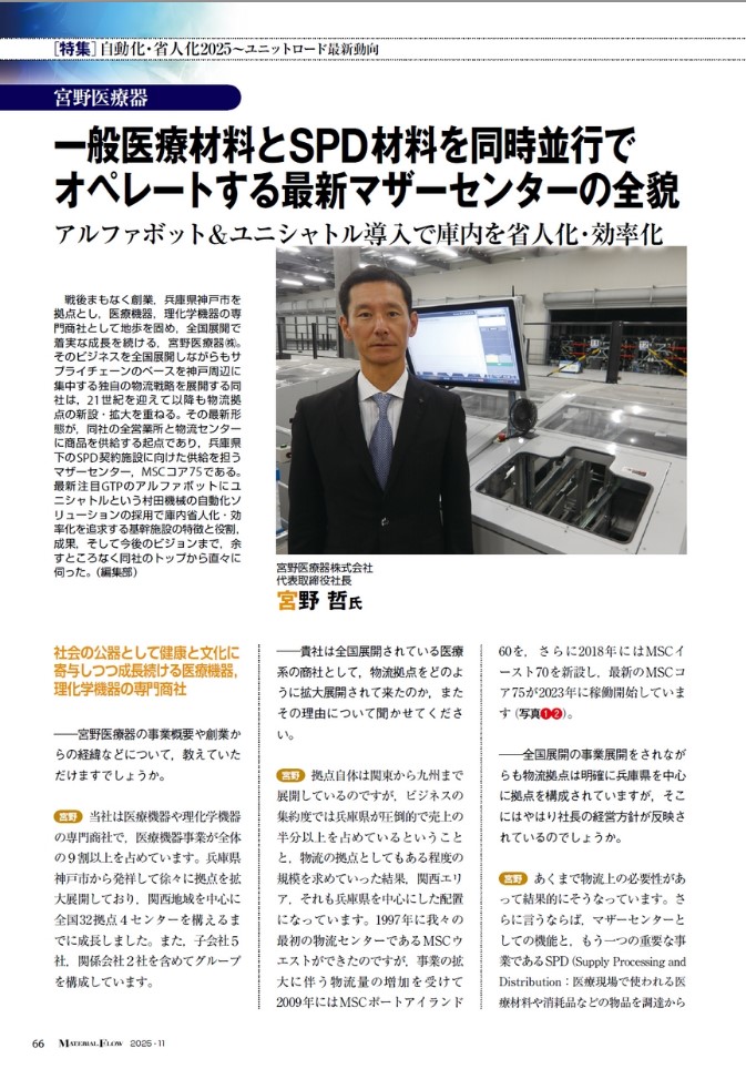 特集「自動化・省人化2025~最新動向」にて、弊社代表取締役社長・宮野のインタビューをはじめ、物流センターにおける入荷から出荷までの一連の流れや、最新の自動化技術、省人化への取り組みについて11ページにわたり詳しく紹介されています。