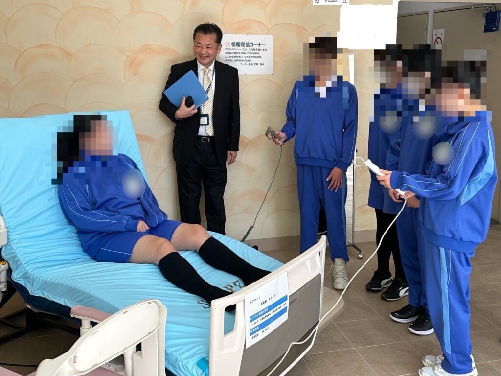 ストーマの歴史、福祉用具の紹介から吸引器、酸素濃縮器、パルスオキシメーター、電動アシスト付き歩行器、電動ベッド+エアーマットの実機を用いての体験学習をしました。真剣に取り組む生徒たちの姿に社員一同、活力をいただきました。