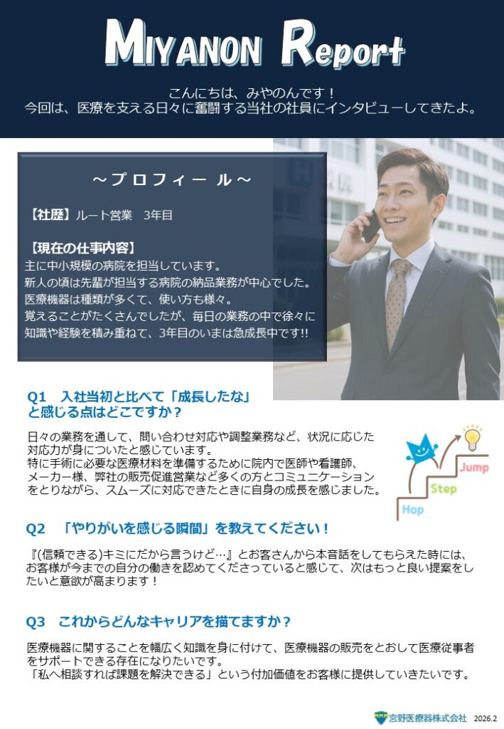 医療の現場を支える仕事って、どんな毎日だろう?今回の MIYANON Report では、入社3年目の若手社員に、仕事のやりがいや成長の実感を率直に語ってもらいました。「医療に関わる仕事に興味がある」「営業職ってどんな働き方?」そんな学生の皆さんにこそ読んでほしい内容です。先輩社員のリアルな声を、ぜひご覧ください。
